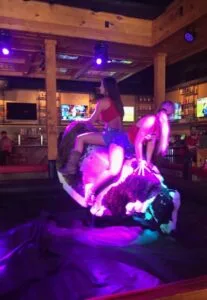So when another summer’s vacation – Cape Fear area most years – rolled around, we were in Carolina Beach, N.C., where they had a beachy saloon, with an electric bull. My mom is an extremely, um, persuasive individual (like me). She told them I would be coming in the bar; I would be riding that bull. I did. Good ride. Got tossed.